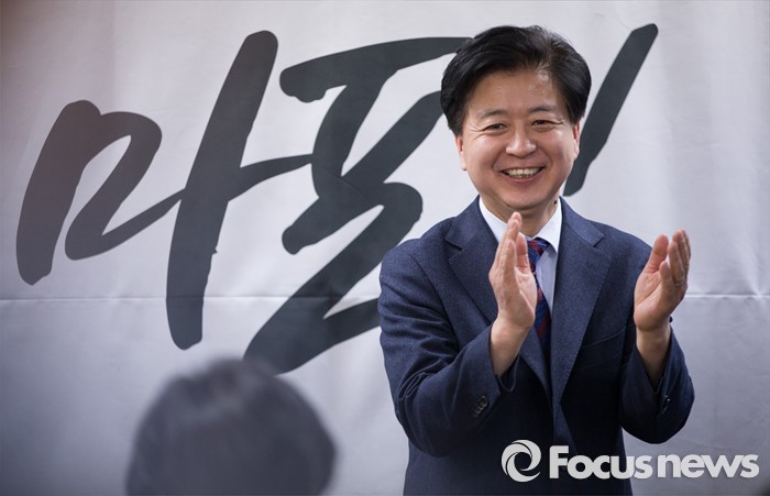 (서울=포커스뉴스) 노웅래 더불어민주당 의원이 15일 오후 서울 마포구 백범로 선거사무소 개소식에서 박수를 치고 있다.