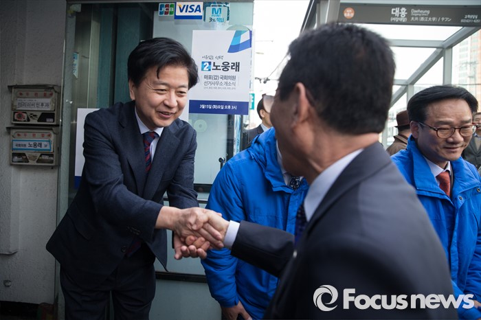 (서울=포커스뉴스) 노웅래 더불어민주당 의원이 15일 오후 서울 마포구 백범로 선거사무소 개소식에서 참석자들과 인사를 나누고 있다.