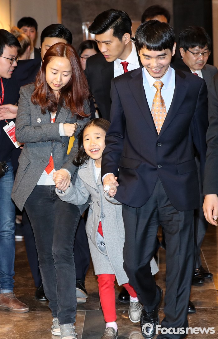 (서울=포커스뉴스) 15일 오후 서울 광화문 포시즌스 호텔에서 열린 구글 딥마인드 챌린지 매치 시상식을 마친 바둑기사 이세돌 9단(맨 오른쪽)이 아내 김현진 씨, 딸 혜림 양과 함께 발걸음을 옮기고 있다.