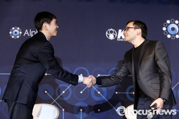 (서울=포커스뉴스) 15일 오후 서울 광화문 포시즌스 호텔에서 열린 구글 딥마인드 챌린지 매치 제5국 기자회견을 마친 바둑기사 이세돌 9단과 데미스 하사비스 구글 딥마인드 최고경영자가 악수하고 있다.