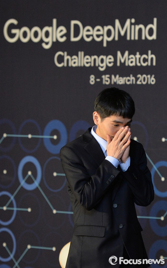 (서울=포커스뉴스) 15일 오후 서울 광화문 포시즌스 호텔에서 열린 구글 딥마인드 챌린지 매치 제5국 기자회견을 마친 바둑기사 이세돌 9단과 무대를 내려가고 있다.