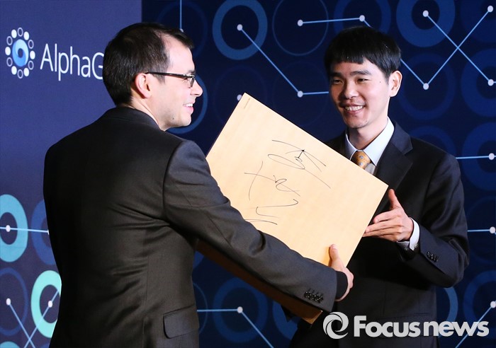(서울=포커스뉴스) 15일 오후 서울 광화문 포시즌스 호텔에서 열린 구글 딥마인드 챌린지 매치 시상식에서 데미스 하사비스 구글 딥마인드 최고경영자가 바둑기사 이세돌 9단에게 바둑판을 선물받고 있다.