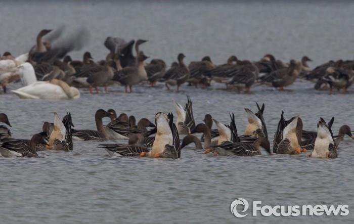 (하남=포커스뉴스) 번식의 계절인 새봄을 맞아 고향으로 떠날 채비를 하는 겨울철새 큰기러기들이 16일 오전 한강에서 평소에 숨겨져 있던 배설강(생식기)을 내보이며 배우자를 찾고 있다.