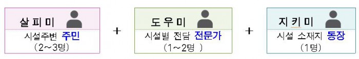 '더안전시민모임'은 재난위험시설에 시설주변 주민 2~3명이 참여하는 '살피미', 시설 전담 안전 전문가 1~2명이 맡게 될 '도우미', 시설 소재지 동장인 '지키미'로 구성된다.