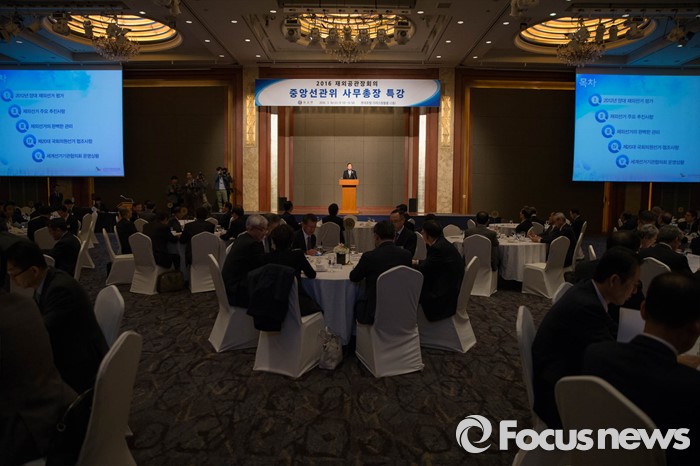 (서울=포커스뉴스) 16일 오전 서울 중구 롯데호텔에서 열린 2016 재외공관장회의- 중앙선관위 사무총장 특강에서 김용희 중앙선관위 사무총장이 참석자들에게 강의를 하고 있다.