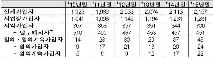 그는 “경력단절 전업주부의 보험료 추후납부 허용, 장애ㆍ유족연금 수급기준 개선, 노령ㆍ장애연금과 유족연금 중복지급률 상향 조정 등이 포함된 국민연금법 개정안도 조속히 국회를 통과해 국민연금 수급권 강화ㆍ국민신뢰 제고가 이루어지기를 기대한다”고 덧붙였다.국민연금 가입자 현황(단위: 만명) <자료출처=복건복지부>