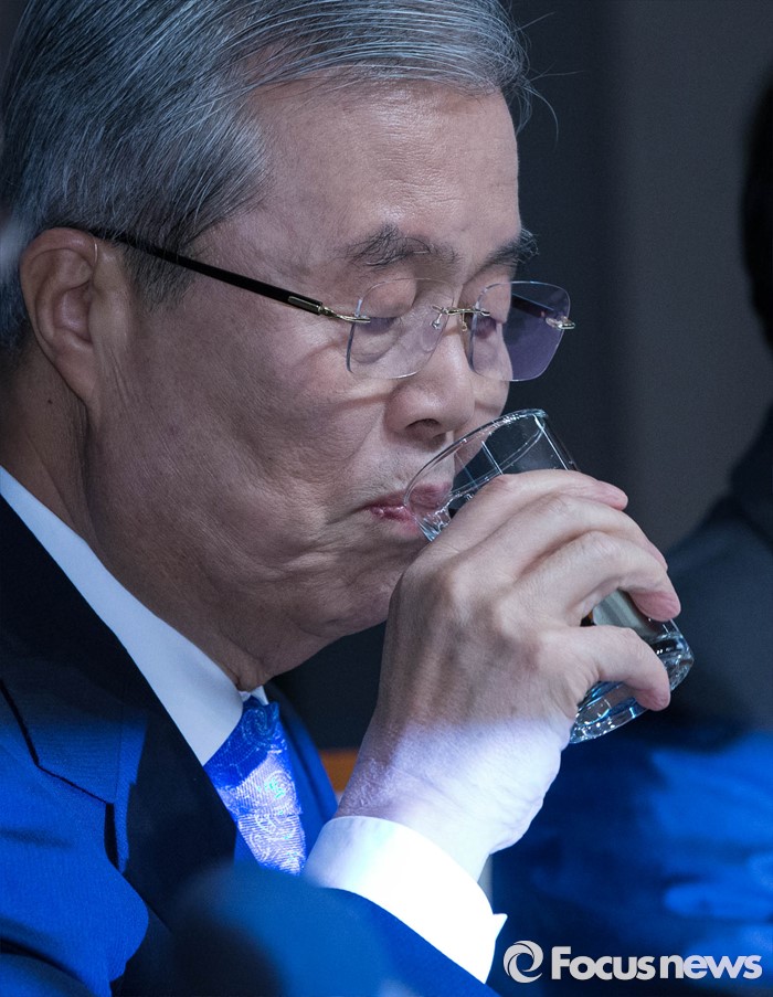 (서울=포커스뉴스) 김종인 비대위 대표가 16일 오전 서울 중구 한국프레스센터 국제회의장에서 열린 '김종인 더불어민주당 비상대책위원회 대표 초청 관훈토론회'에 참석해 물을 마시고 있다.