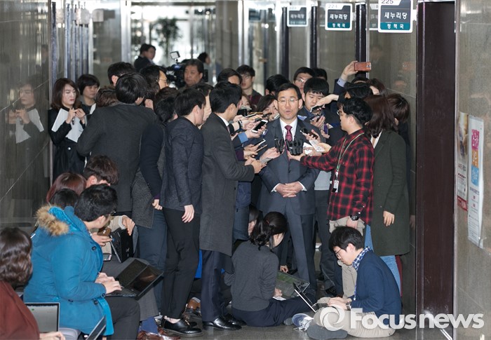 (서울=포커스뉴스) 공천 배제된 주호영 새누리당 의원이 16일 오전 서울 여의도 국회에서 열린 비공개 최고위원회의에 참석한 뒤 취재진 질문에 답하고 있다.