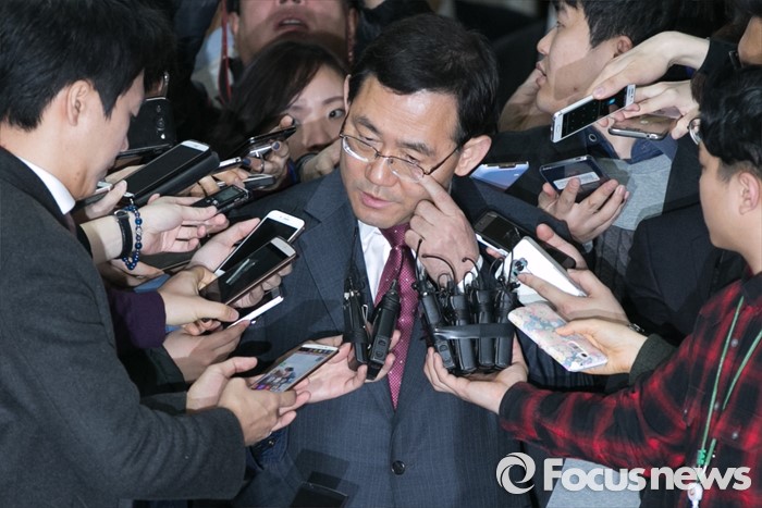 (서울=포커스뉴스) 공천 배제된 주호영 새누리당 의원이 16일 오전 서울 여의도 국회에서 열린 비공개 최고위원회의에 참석한 뒤 취재진 질문에 답하고 있다.