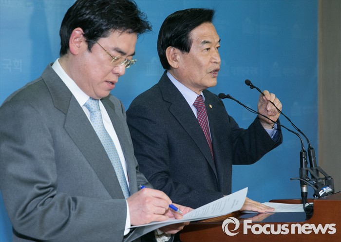 (서울=포커스뉴스) 20대 총선 공천 배제(컷오프)된 서상기(오른쪽), 홍지만 새누리당 의원이 16일 오전 서울 여의도 국회 정론관에서 불출마 선언 및 당 결정 수용 기자회견을 하고 있다.