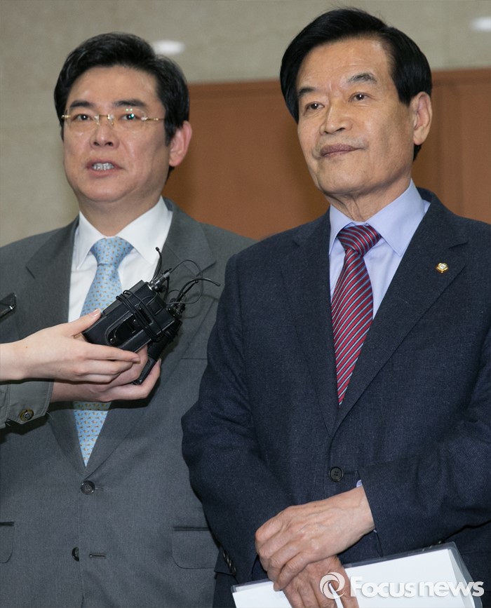 (서울=포커스뉴스) 20대 총선 공천 배제(컷오프)된 서상기(오른쪽), 홍지만 새누리당 의원이 16일 오전 서울 여의도 국회 정론관에서 불출마 선언 및 당 결정 수용 기자회견을 마친 뒤 취재진 질문에 답하고 있다.