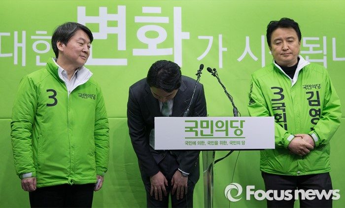 (서울=포커스뉴스) 더불어민주당을 탈당한 정호준 의원(가운데)이 16일 오후 서울 마포구 국민의당 당사에서 국민의당 입당 인사를 하고 있다. 왼쪽부터 안철수 국민의당 상임공동대표, 정호준 의원, 김영환 공동선대위원장