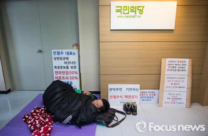 (서울=포커스뉴스) 16일 오전 서울 마포구 국민의당사에서 관악을 이행자 예비후보의 지지자가 공천룰 방식에 항의하며 노숙 농성을 벌이고 있다.