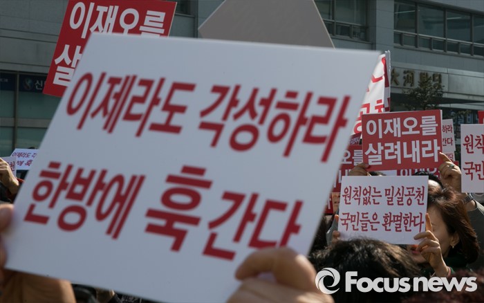 (서울=포커스뉴스) 16일 오전 서울 여의도 새누리당사 앞에서 공천 배제(컷오프)된 이재오 의원의 지지자들이 공천관리위원회의 결정 철회를 촉구하는 집회를 하고 있다.