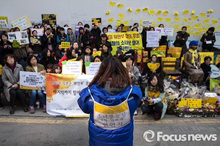 (서울=포커스뉴스) 16일 오후 서울 종로구 옛 일본 대사관 앞에서 열린 제 1222차 정기 수요집회에서 한 여대생이 자유발언을 하고 있다.