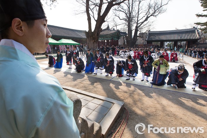 (서울=포커스뉴스) 16일 오전 서울 종로구 성균관 대성전에서 열린 '2016 춘기석전대제'에서 제관들이 성현들을 향해 절 하고 있다.