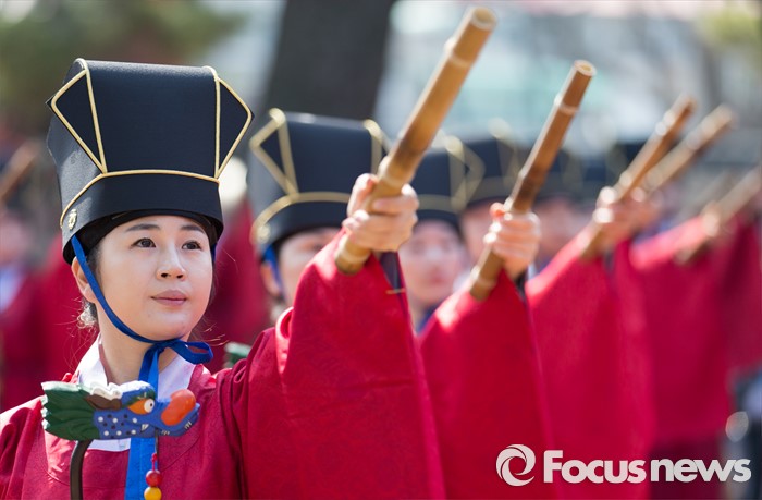 (서울=포커스뉴스) 16일 오전 서울 종로구 성균관 대성전에서 열린 '2016 춘기석전대제'에서 일무보존회 회원들이 일무를 추고 있다.
