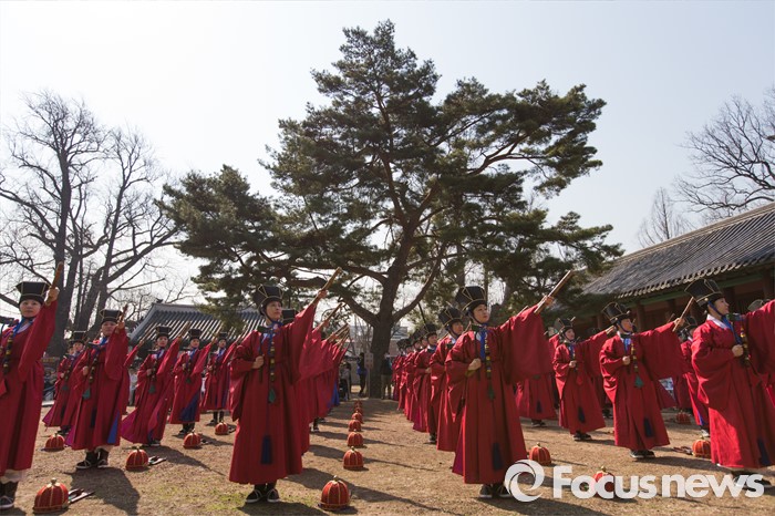 (서울=포커스뉴스) 16일 오전 서울 종로구 성균관 대성전에서 열린 '2016 춘기석전대제'에서 일무보존회 회원들이 일무를 추고 있다.