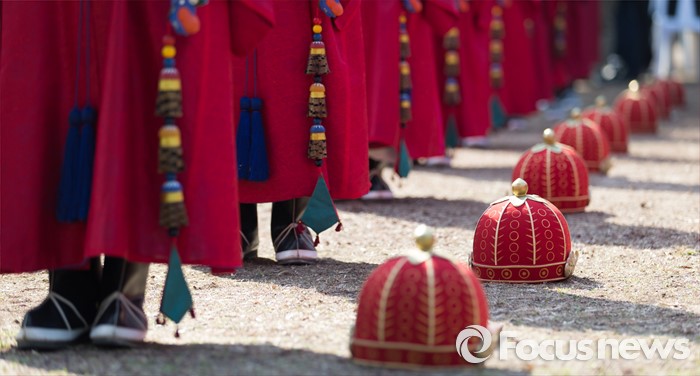 (서울=포커스뉴스) 16일 오전 서울 종로구 성균관 대성전에서 열린 '2016 춘기석전대제'에서 일무보존회 회원들의 피변관이 놓여 있다.