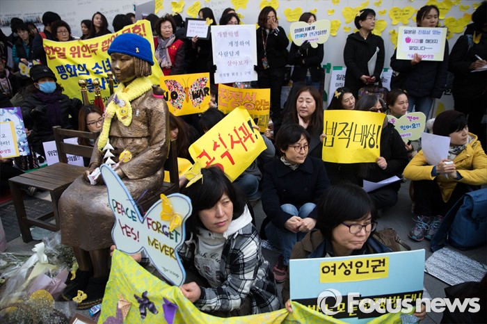 (서울=포커스뉴스) 16일 오후 서울 종로구 옛 일본 대사관 앞에서 '일본군 위안부 문제해결을 위한 1222차 정기 수요집회'가 열리고 있다.