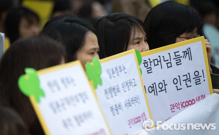 (서울=포커스뉴스) 16일 오후 서울 종로구 옛 일본 대사관 앞에서 열린 제 1222차 정기 수요집회에 참석한 시민들이 일본의 진정성 있는 사과를 촉구하는 손피켓을 들고 있다.