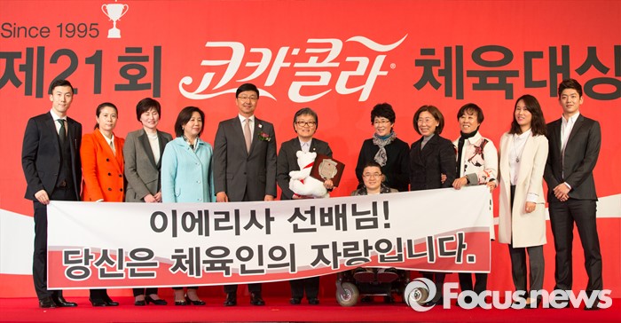 (서울=포커스뉴스) 16일 오전 서울 중구 더플라자호텔 그랜드볼룸에서 제21회 코카콜라 체육대상 시상식에 참석한이에리사(왼쪽 여섯번째) 새누리당 의원이 공로상을 수상 후 기념촬영을 하고 있다.