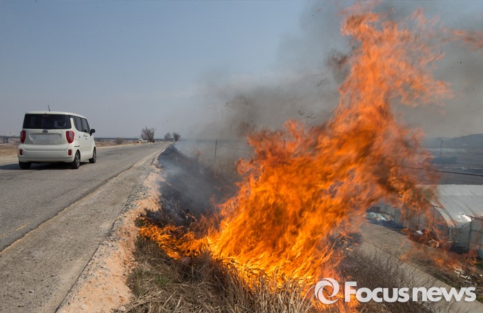 (청주=포커스뉴스) 16일 오후 충북 청주시 흥덕구 신대동 차로 바로 옆에서 눈두렁이 태우기를 하고 있어 지나는 차량에 위협이 되고 있다.