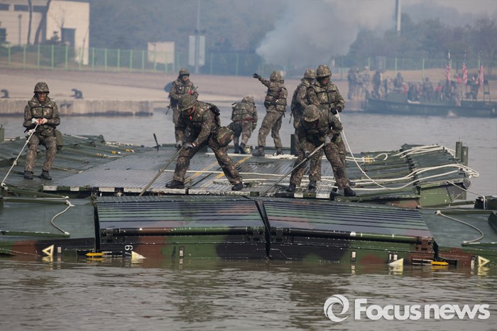 (이천=포커스뉴스) 16일 오전 경기도 이천시 7공병여단 도하훈련장에서 열린 '한·미 연합 소부대 도하훈련'에서 한국군 제7공병여단 도하대대 장병들이 부교를 설치하고 있다.