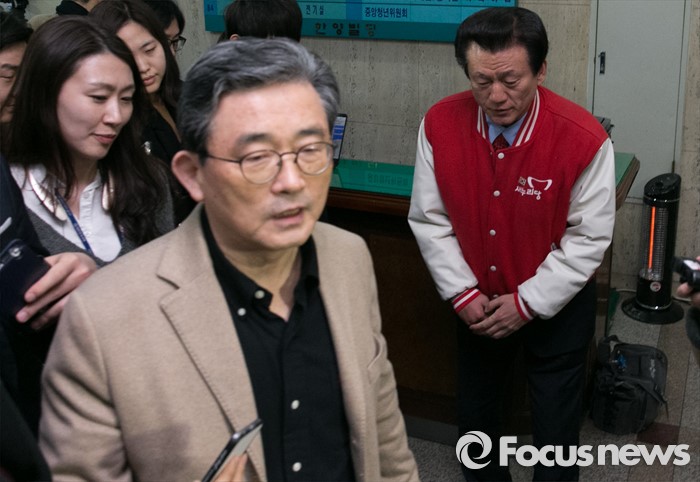 (서울=포커스뉴스) 이한구(왼쪽) 새누리당 공천관리위원장이 16일 오후 서울 여의도 당사에서 공천관리위원회의에 참석하며 손종익 대구 동구갑 예비후보의 인사를 받고 있다.