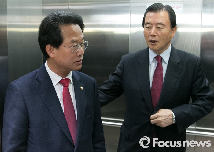 (서울=포커스뉴스) 공천 배제(컷오프)된 류성걸(왼쪽) 새누리당 의원이 16일 오후 서울 여의도 당사에서 공천관리위원회의에 참석하는 이한구 위원장을 기다리며 홍문표 위원과 대화하고 있다.