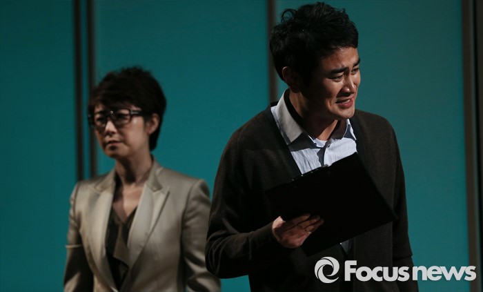 (서울=포커스뉴스) 16일 오후 서울 종로구 미마지아트센터 눈빛극장에서 열린 연극 '두 코리아의 통일' 프레스콜에 참석한 배우 박경구(오른쪽)가 주요장면을 시연하고 있다.