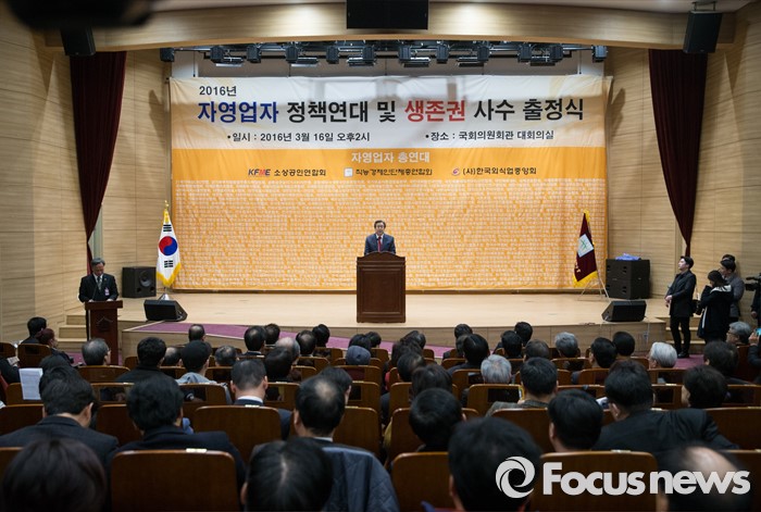 (서울=포커스뉴스) 김무성 새누리당 대표와 김종인 더불어민주당 대표가 16일 오후 서울 여의도 국회 의원회관에서 열린 '자영업자 정책연대 및 생존권 사수 출정식'에 참석하고 있다.