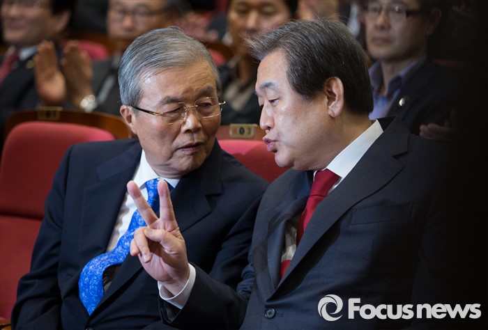 (서울=포커스뉴스) 김무성 새누리당 대표(오른쪽)와 김종인 더불어민주당 대표가 16일 오후 서울 여의도 국회 의원회관에서 열린 '자영업자 정책연대 및 생존권 사수 출정식'에 참석해 대화를 나누고 있다.