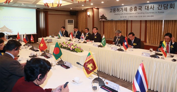 (서울=포커스뉴스) 이기권 고용노동부장관은 16일 오후 서울 중구 프레스센터에서 열린 고용허가제 송출국 대사 간담회에서 각 국 대사들과 논의를 하고 있다. <사진제공=고용노동부>
