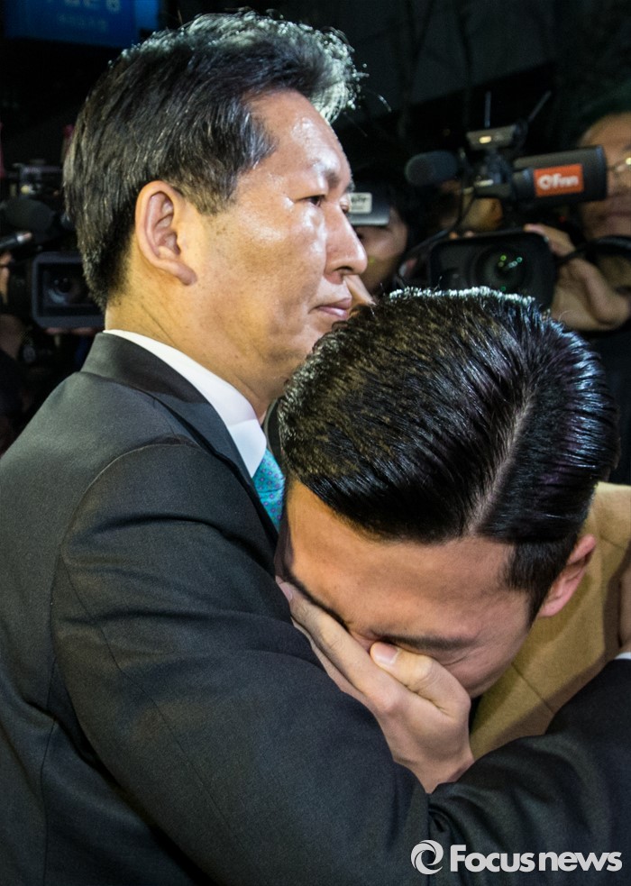 (서울=포커스뉴스) 20대 총선에서 공천배제된 정청래 더불어민주당 의원이 16일 오후 서울 여의도 당사 앞에서 기자회견을 가진 후 한 지지자를 위로하고 있다.