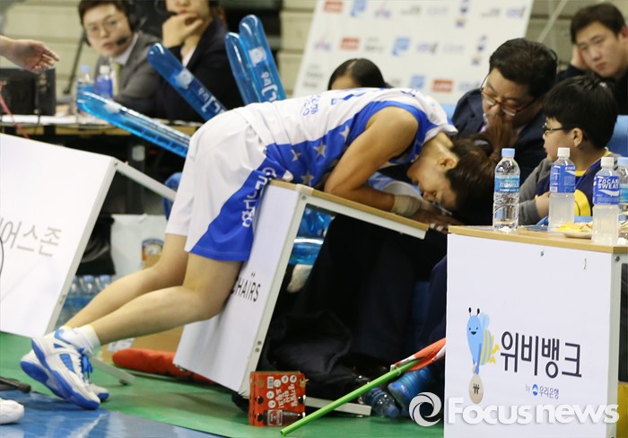 (춘천=포커스뉴스) 춘천호반체육관에서 열린 2015~2016 여자프로농구 우리은행-KEB하나 챔피언결정전 1차전에서 우리은행 임영희가 사이드라인의 관중석을 덮치고 있다.