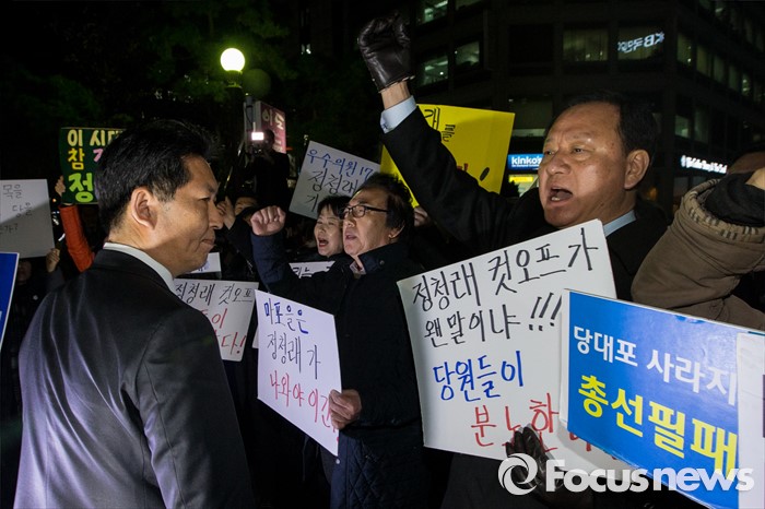 (서울=포커스뉴스) 20대 총선에서 공천배제된 정청래 더불어민주당 의원이 16일 오후 서울 여의도 당사 앞에서 기자회견을 가진 후 지지자들을 바라보고 있다.
