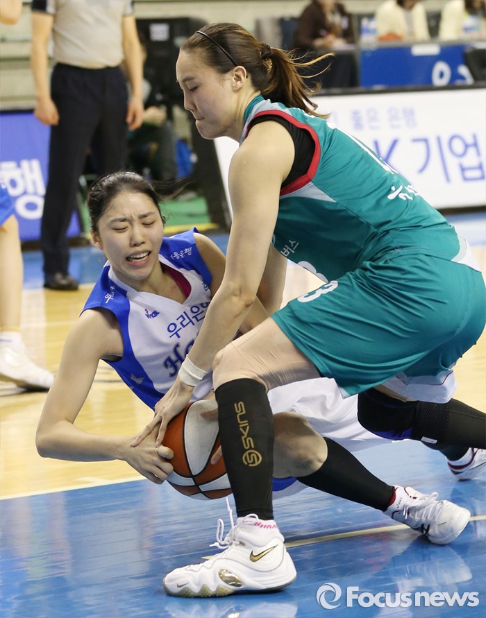 (춘천=포커스뉴스) 춘천호반체육관에서 열린 2015~2016 여자프로농구 우리은행-KEB하나 챔피언결정전 1차전에서 KEB하나 김정은이 우리은행 이승아의 볼을 뺏으려 잡고 있다.