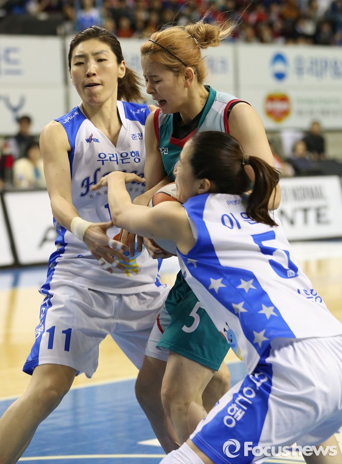 (춘천=포커스뉴스) 춘천호반체육관에서 열린 2015~2016 여자프로농구 우리은행-KEB하나 챔피언결정전 1차전에서 우리은행 임영희와 이은혜가 KEB하나 김이슬의 볼을 가로채려 달려들고 있다.