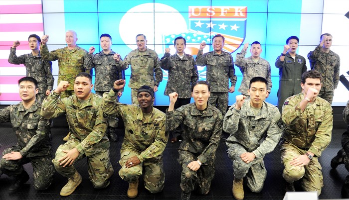 (서울=포커스뉴스) 한민구(윗줄 가운데) 국방부 장관이 16일 키리졸브(KR) 연습이 진행중인 한·미연합군사령부 훈련장을 방문, 연습에 전념하고 있는 장병들을 격려하고 기념촬영을 하고 있다. <사진제공=국방부>