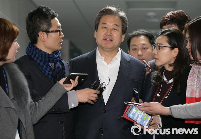 (서울=포커스뉴스) 김무성 새누리당 대표가 17일 오전 서울 여의도 국회 의원회관 의원실로 출근하며 취재진 질문에 답하고 있다.