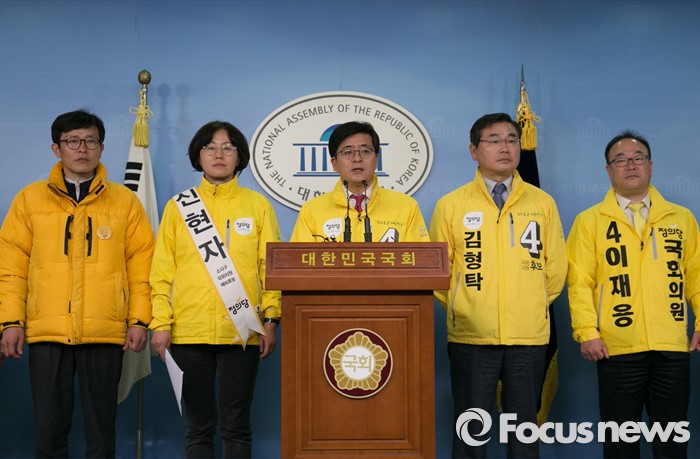 (서울=포커스뉴스) 박원석(오른쪽 세번째) 정의당 경기도당위원장과 예비후보들이 17일 오전 서울 여의도 국회 정론관에서 야권연대 관련 기자회견을 하고 있다.
