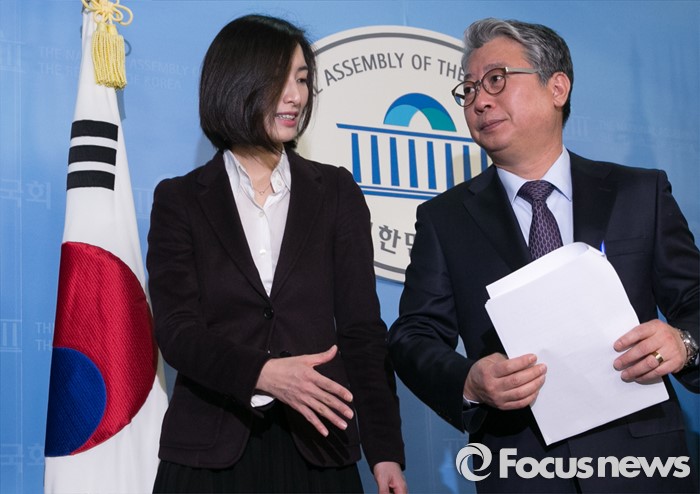 (서울=포커스뉴스) 더불어민주당에 입당한 조응천(오른쪽) 전 청와대 공직기강비서관이 17일 오전 서울 여의도 국회 정론관에서 20대 총선 경기 남양주갑 출마 선언을 마친 뒤 비례대표 심사에서 탈락한 김빈 빈컴퍼니 대표와 함께 나서고 있다.