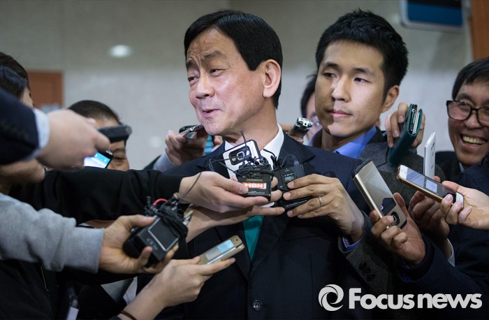 (서울=포커스뉴스) 공천에서 배제 된 새누리당 3선 중진 진영 의원이 17일 오후 서울 여의도 국회 정론관에서 탈당 기자회견 마친 후 기자들의 질문을 받고 있다.