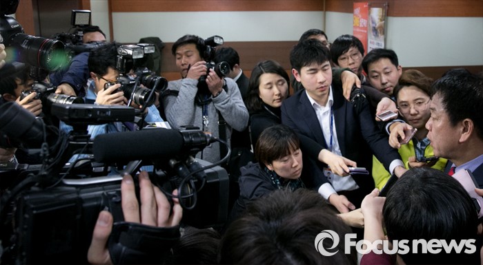 (서울=포커스뉴스) 새누리당 공천관리위원회 외부위원들이 김무성 대표의 사과를 요구하며 회의를 보이콧한 17일 오후 서울 여의도 당사에서 회의를 마친 박종희 제2사무부총장이 취재진 질문에 답하고 있다.