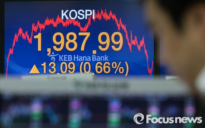 (서울=포커스뉴스) 17일 서울 중구 KEB외환은행 본점 딜링룸 전광판에 코스피지수가 전일보다 13.09p (0.66%) 상승한 1987.99를 나타내고 있다. 코스피는 장중 2000선을 돌파했으며, 원·달러 환율은 전일 종가 대비 20원 내린 1173.3원으로 지난해 12월 30일(1172.5원) 이후 약 석달만에 종가 기준 1170원대를 기록했다.