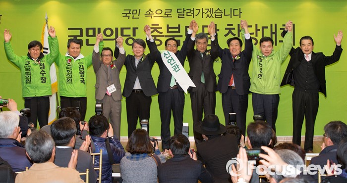 (청주=포커스뉴스) 17일 오후 충북 청주 흥덕구 리호관광호텔에서 열린 국민의당 충북도당 창당대회에서 안철수 공동대표와 후보자 및 당원들이 총선 승리를 다짐하고 있다.