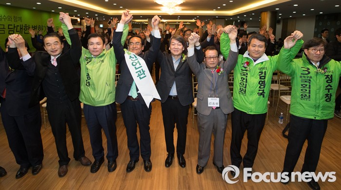 (청주=포커스뉴스) 17일 오후 충북 청주 흥덕구 리호관광호텔에서 열린 국민의당 충북도당 창당대회에서 안철수 공동대표와 후보자 및 당원들이 총선 승리를 다짐하고 있다.