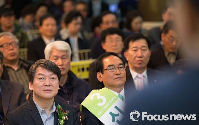 (청주=포커스뉴스) 17일 오후 충북 청주 흥덕구 리호관광호텔에서 열린 국민의당 충북도당 창당대회에서 안철수 공동대표가 신언관 충북도당위원장의 수락연설을 듣고 있다.