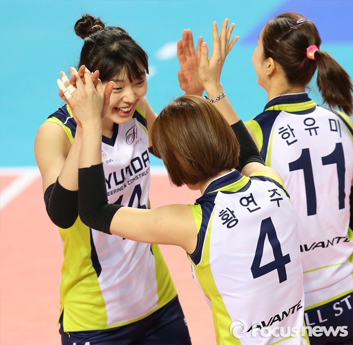 (화성=포커스뉴스) 17일 화성실내체육관에서 열린 2015-2016 V-리그 여자부 챔피언결정전 1차전 IBK기업은행-현대건설 경기에서 현대건설 양효진과 황연주가 득점을 올리고 하이파이크를 하며 기뻐하고 있다.
